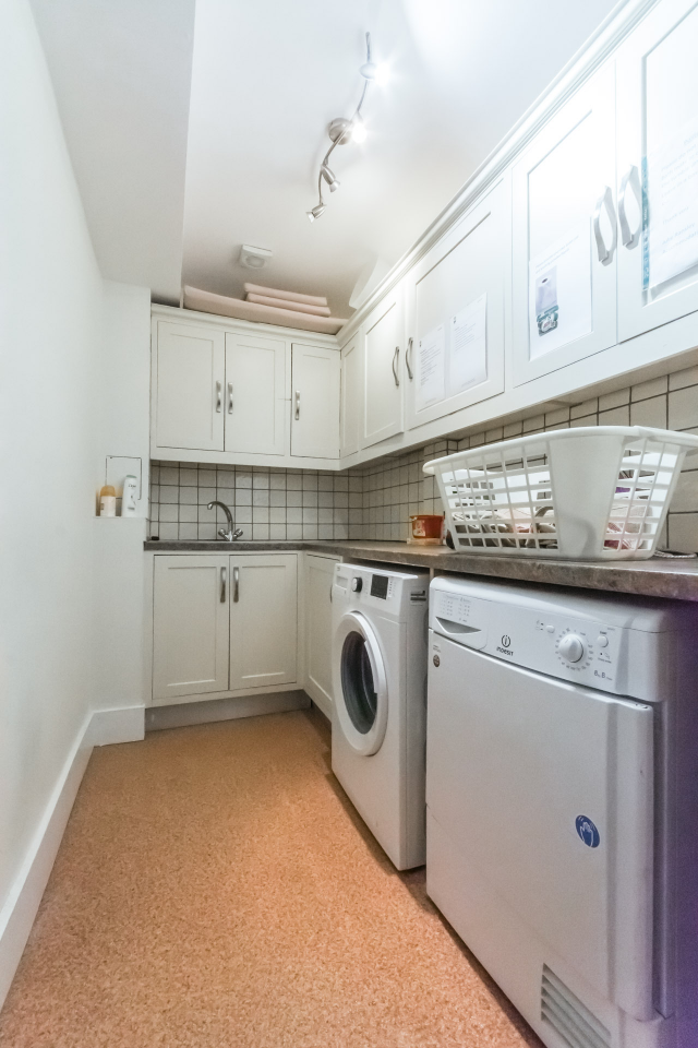- Laundry room with iron, washing machine and clothes dryer.